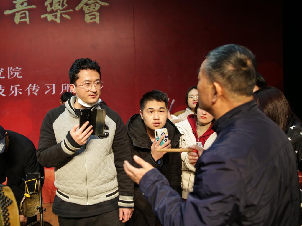 西安都城隍庙鼓乐社的艺术家们为同学们精心演奏了《十六拍》《出鼓》《尺调双云锣座乐全套》等传统经典曲目。老艺人们虔诚肃穆,令人肃然起敬;大学生们神情专注,沉浸在气势恢宏的风华雅乐中。全场不时响起热烈而经久不息的掌声,同学们为老艺人们的坚守而感慨。演出结束后,同学们依旧热情不减,围着老艺术家们了解鼓乐知识。