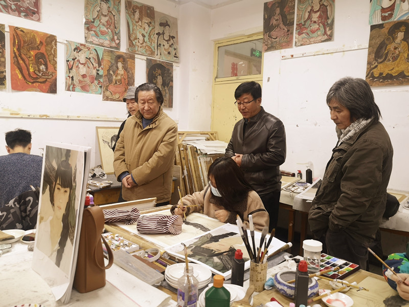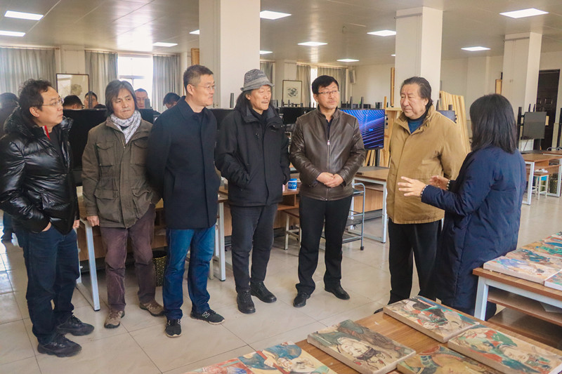 杨晓阳一行听取了我校艺术学院院长孟强就院系近些年在教学科研、办学思路等方面的具体情况介绍,参观了艺术学院数字临摹室、壁画工作室、学生书画室等,并向美术老师们了解了美术专业的教学情况,与课堂师生进行了交流。