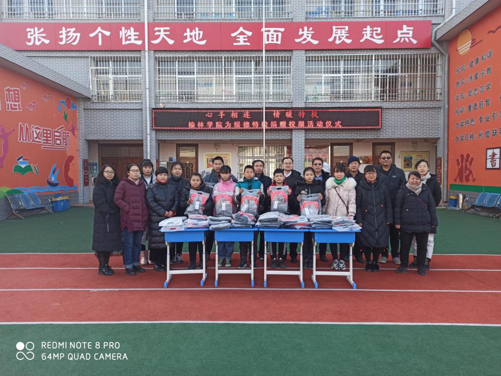 12月25日上午,我校扶贫干部赴绥德县特殊学校,看望了那里的老师、学生,并举行“心手相连、情暖特校”捐赠活动,在寒冷的冬日为孩子们送上了32套运动服。捐赠活动在特殊学校教学楼前举行,当一套套衣服送到孩子们手中时,稚嫩的脸上露出了笑容。孩子们还用不太流畅的语言表达了感谢,之后,我校与特殊学校领导、老师进行了座谈,就孩子们的感知能力、认知能力、运动能力、语言与沟通能力、社会适应能力等各方面情况进行了了解,并希望将来有针对性的展开进一步帮扶,做到“帮到实处、扶到点位、同心协作、共同提升”。