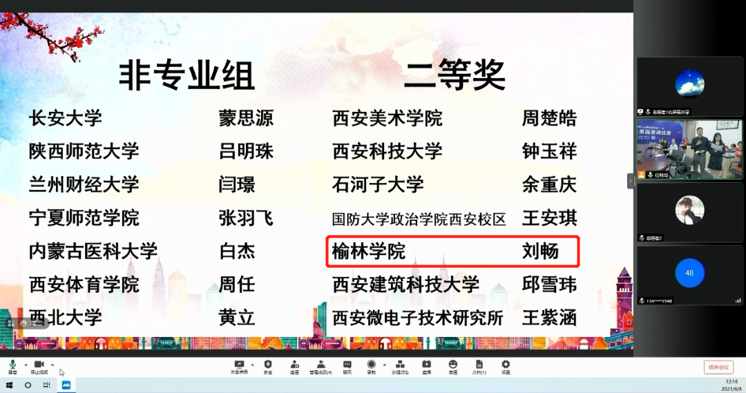 本次大赛由陕西省学位与研究生教育学会、教育部学位与研究生教育发展中心《中国研究生》编辑部主办,西安电子科技大学和陕西省研究生外语教学研究会负责承办。今年是我校首次派学生参加研究生赛事。大赛的主题为“新时代,享未来”,采取线上进行的方式。分主题演讲、即兴演讲和外教问答三个环节进行,吸引了我校、西交大,西工大,西北大学,陕西师范大学等45所高校的70名选手同台竞技。