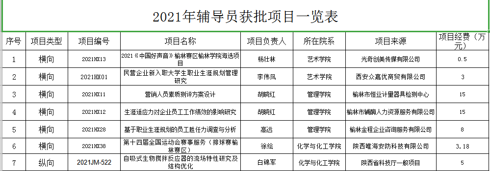 截止目前,共有艺术学院李伟凤、杨壮林,管理学院胡晓红、高远,化学与化工学院白锦军、徐绘等6名辅导员成功签约1项纵向及6项横向科研项目合作协议,金额总计49.68万元。项目的获批不仅提升了辅导员队伍自身的科研水平和服务榆林地方经济发展能力,同时也激发了辅导员的科研内生动力,为其创新性开展学生管理工作奠定理论基础。科研工作与学生思政工作有机结合,相互促进,将有力提升学校思想政治工作再上新台阶,奋力谱写辅导员科技创新新篇章。