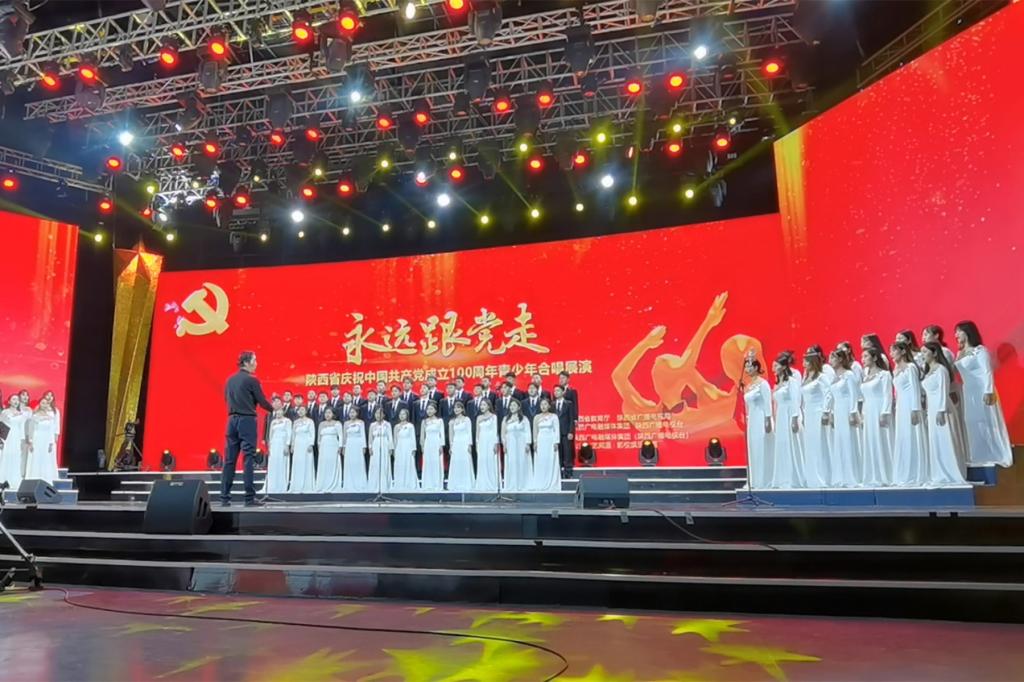 陕西省庆祝中国共产党成立100周年“永远跟党走”青少年合唱展演活动,由陕西省教育厅、陕西省广播电视局、陕西广电融媒体集团联合主办,旨在以高尚的精神塑造人,以优秀的作品鼓舞人,坚持以美育人、以美化人、以美培元,引导学生树立共产主义远大理想和中国特色社会主义共同理想,增强学生的“四个自信”,立志肩负起民族复兴的时代重任,以优异成绩向中国共产党成立100周年献礼。活动共收到全省120余所大、中、小学推荐报送的参演作品,其中高等学校约60所,11所高校受邀在陕西广播电视台现场录制,并将在陕西广播电视台公共文艺频道进行播出。