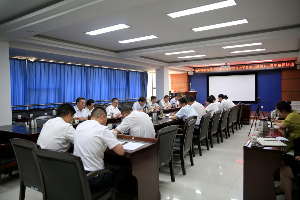 7月1日上午,在集体收看庆祝中国共产党成立100周年大会实况转播后,党委中心组全体成员参观了绥德师范校史展,随即在行政楼四楼会议室召开了专题学习会,深入学习习近平总书记在庆祝中国共产党成立100周年大会上的重要讲话。党委书记张新柱主持,校级领导李治山、张富林、张晓、尚爱军、康伟、姜劲波、闫龙出席。