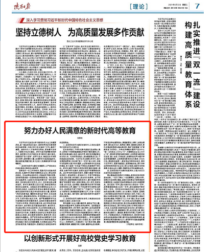 2021年4月30日,校党委书记张新柱在省属高校党史学习教育工作推进座谈会上,作了交流发言。在《陕西日报》《中国教育报》发表《努力办好人民满意的新时代高等教育》《党史学习教育要把握“三个着力”》两篇学习体会文章。《中国社会科学报》专版刊发我校教师撰写的以“传承红色基因、培养时代新人”为主题的系列文章《在校地合作中提升思政课协同育人效果》《以红色基因铸牢青年马克思主义者的理想信念》《党中央转战陕北史的资政育人元素》《以校史教育厚植青年大学生爱国情怀》及《“奋斗”精神凸显培养时代新人的实践价值》《依托实践教学基地夯实思政课育人基础》《红色校史融入课程思政建设的三个着力点》。