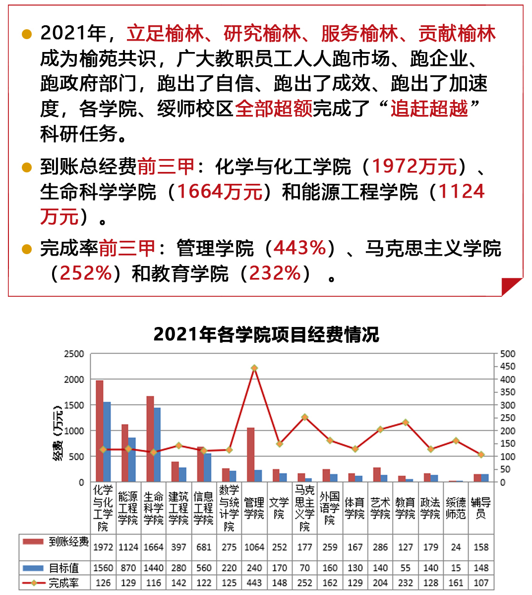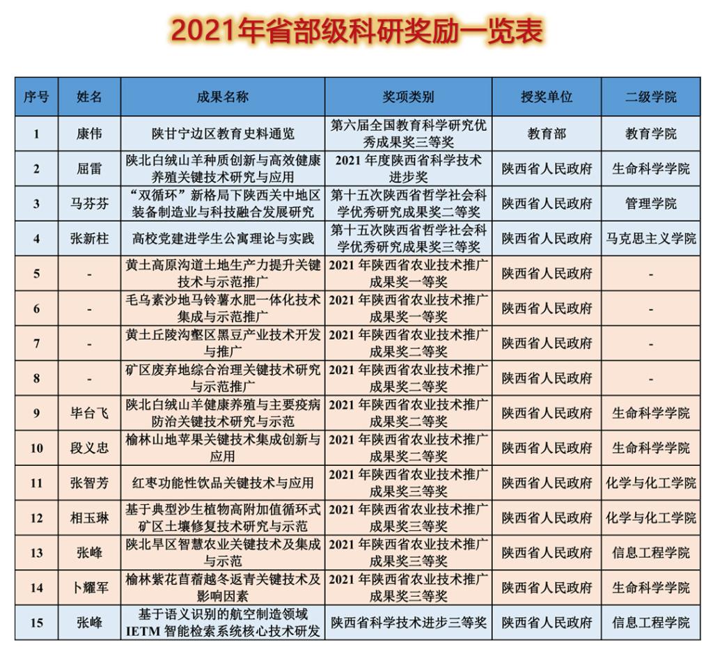 2021年,学校科研获奖创历史新高,先后获得省部级科研奖励15项,其中康伟教授参编的专著《陕甘宁边区教育史料通览》获评全国教育科学优秀研究成果奖著作类三等奖;屈雷教授参与的陕北白绒山羊种质创新与高效健康养殖关键技术研究与应用项目获评陕西省科学技术进步一等奖;学校精心打造的话剧《播火者》入选教育部原创文化精品项目。此外,学校今年还获得陕西省农业技术推广成果奖10项,厅局级科研奖励136项。获批陕西省非物质文化遗产研究基地、陕西省2011协同创新中心——陕北羊产业发展协同创新中心、榆林市公众科学素质与创新发展研究中心3个省级科研平台。申报“四主体一联合”工程技术研究中心1个,榆林市重点实验室及榆林工程技术研究中心15个,省级重点科技创新团队2个。学校在新建(应用型)本科高校省域科研综合竞争指数中位居全国第10位。、