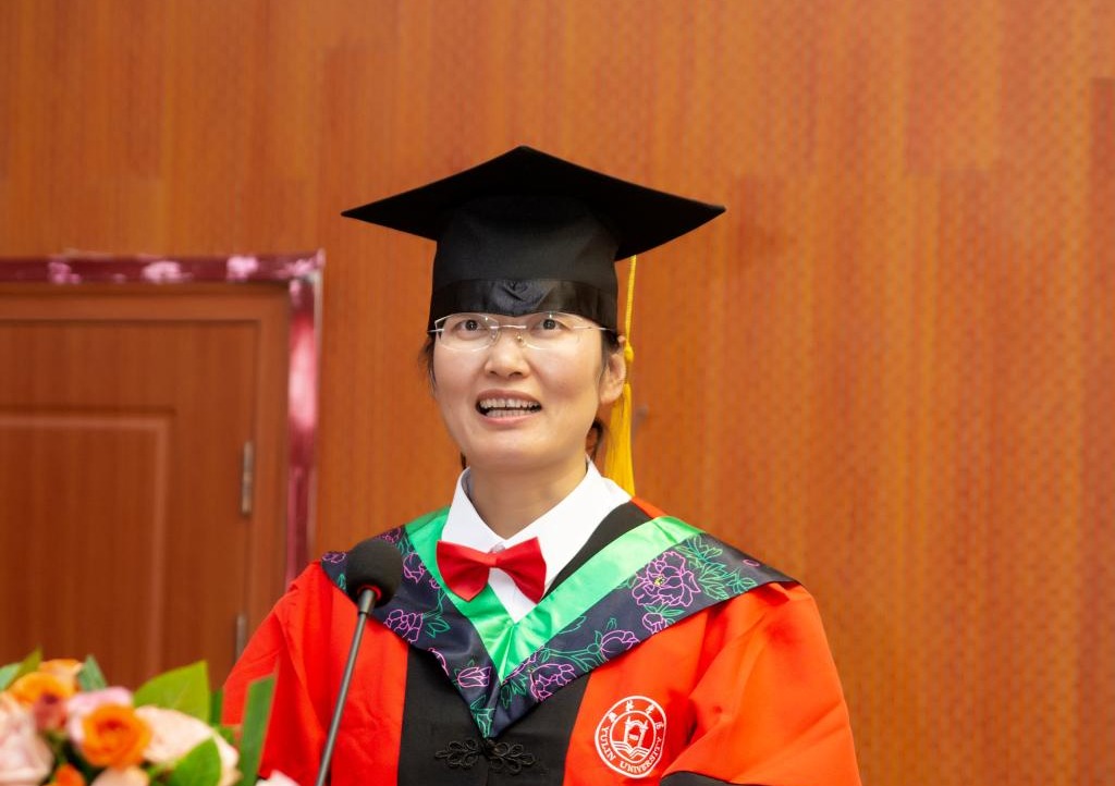 导师代表王雯教授发言。她叮嘱同学们要怀惴对美好生活的向往,仰望星空,脚踏实地,继续发扬奋斗精神,追求更加卓越的自我。