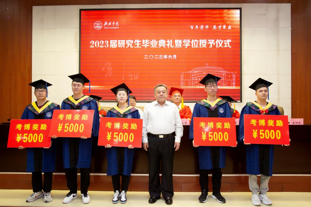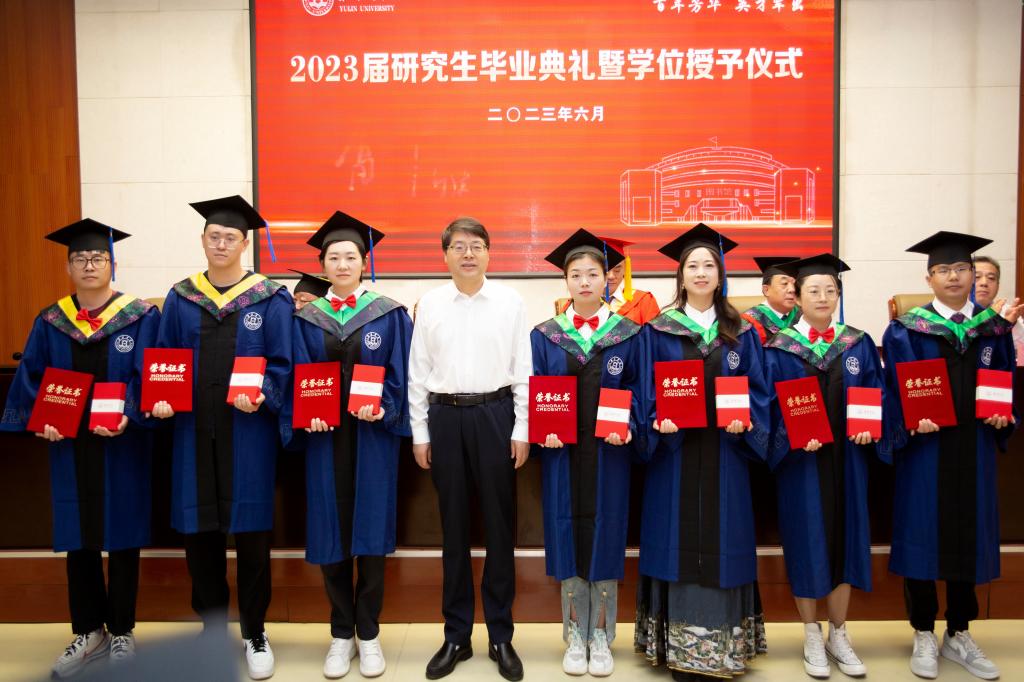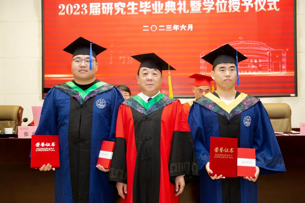 毕业典礼在雄壮的国歌声中拉开了帷幕。张晓宣读《关于授予2023届研究生硕士学位的决议》,许云华为获得硕士学位的66名研究生颁发学位证书并拨流苏,尚爱军宣读《关于表彰2023届优秀硕士学位论文作者及指导教师的决定》《关于表彰2023届优秀毕业研究生、优秀毕业研究生干部的决定》和《关于表彰2023届考博研究生的决定》。在热烈的掌声中,张新柱为2023届优秀硕士学位论文作者及指导教师颁奖,张晓为获得“2023届优秀毕业研究生”称号的同学颁奖,尚爱军为获得“2023届优秀研究生干部”称号的同学颁奖,姜劲波为考取博士研究生的同学颁奖。
