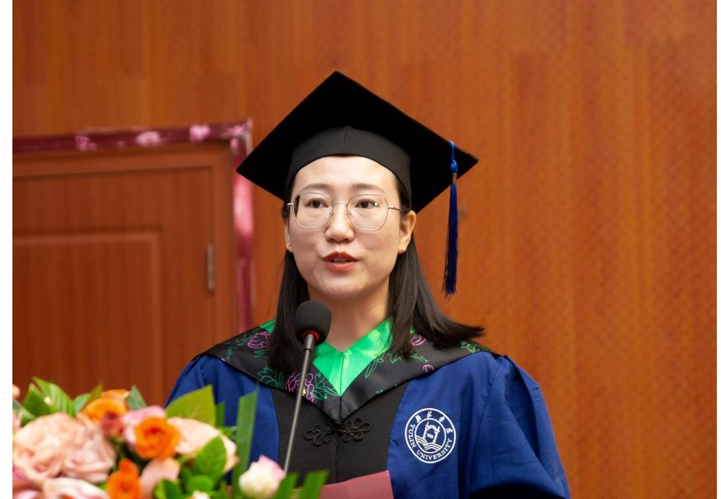 优秀毕业研究生代表付琪同学发言。她深情回顾了在母校的成长经历,表示将牢记母校“读书勿忘救国,救国勿忘读书”的校训,积极投身到中华民族复兴的伟大事业中去。