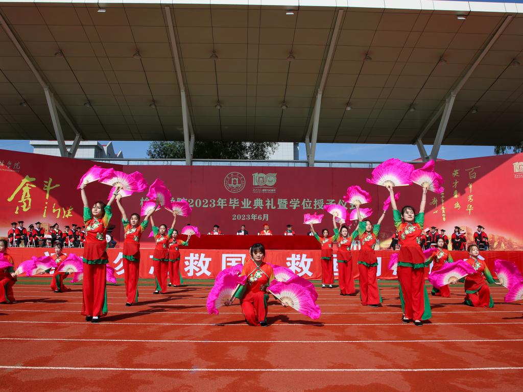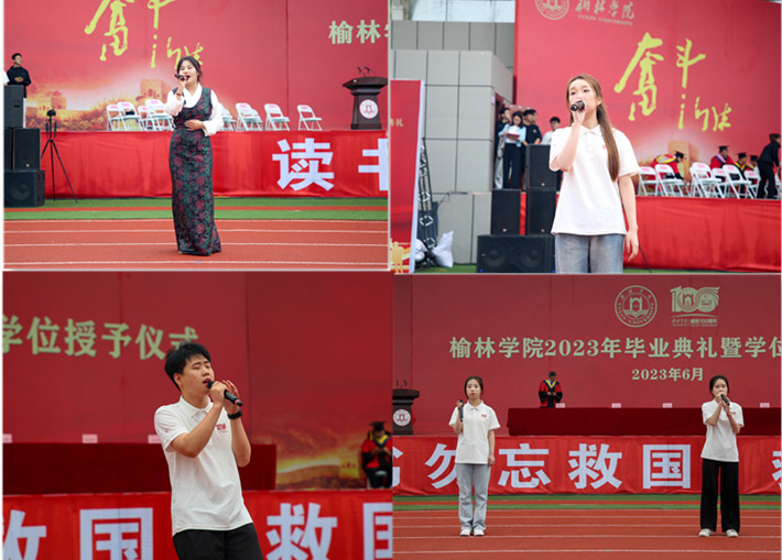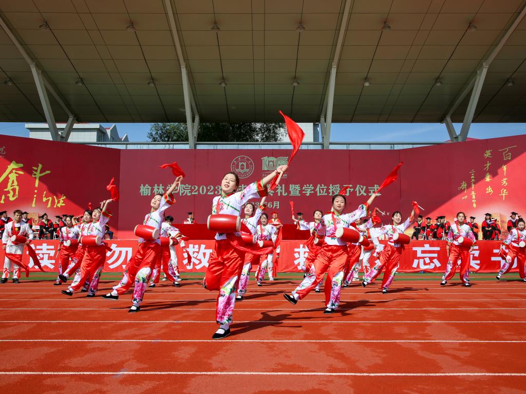 毕业典礼在《陕北民歌》《陕北秧歌》《激情追梦》(校歌)《凤凰花开的路口》合唱声中落下帷幕。