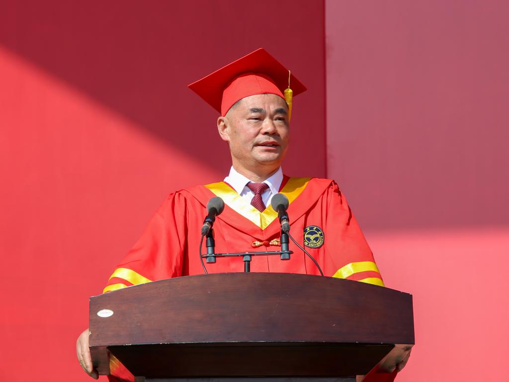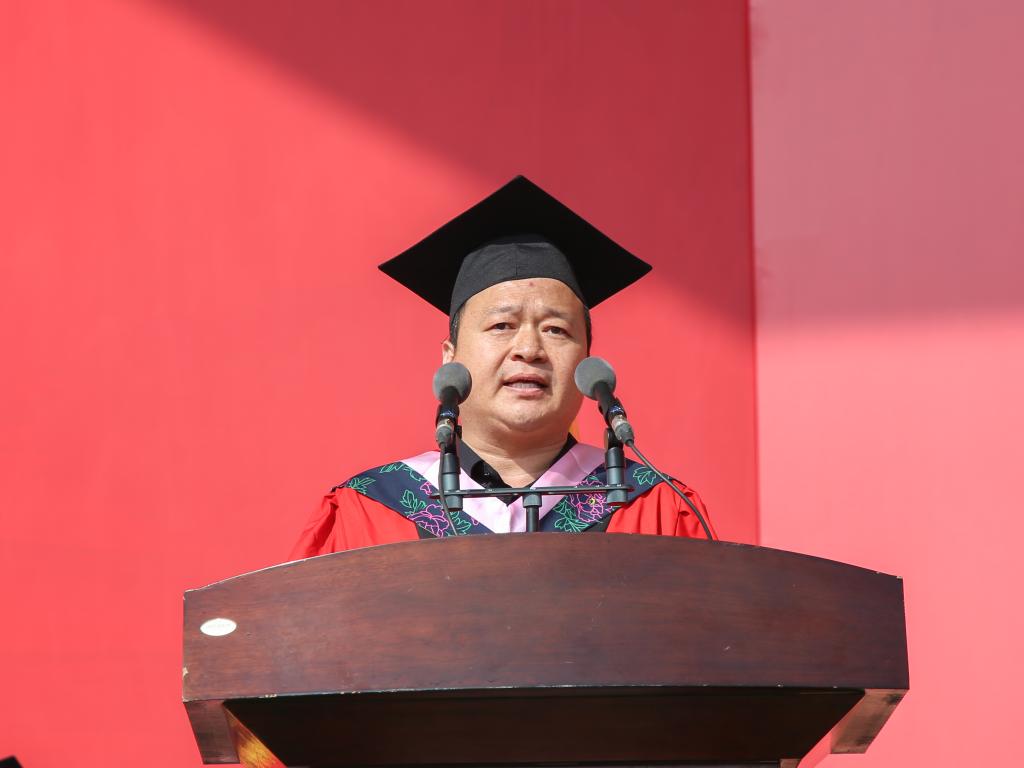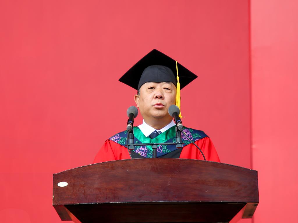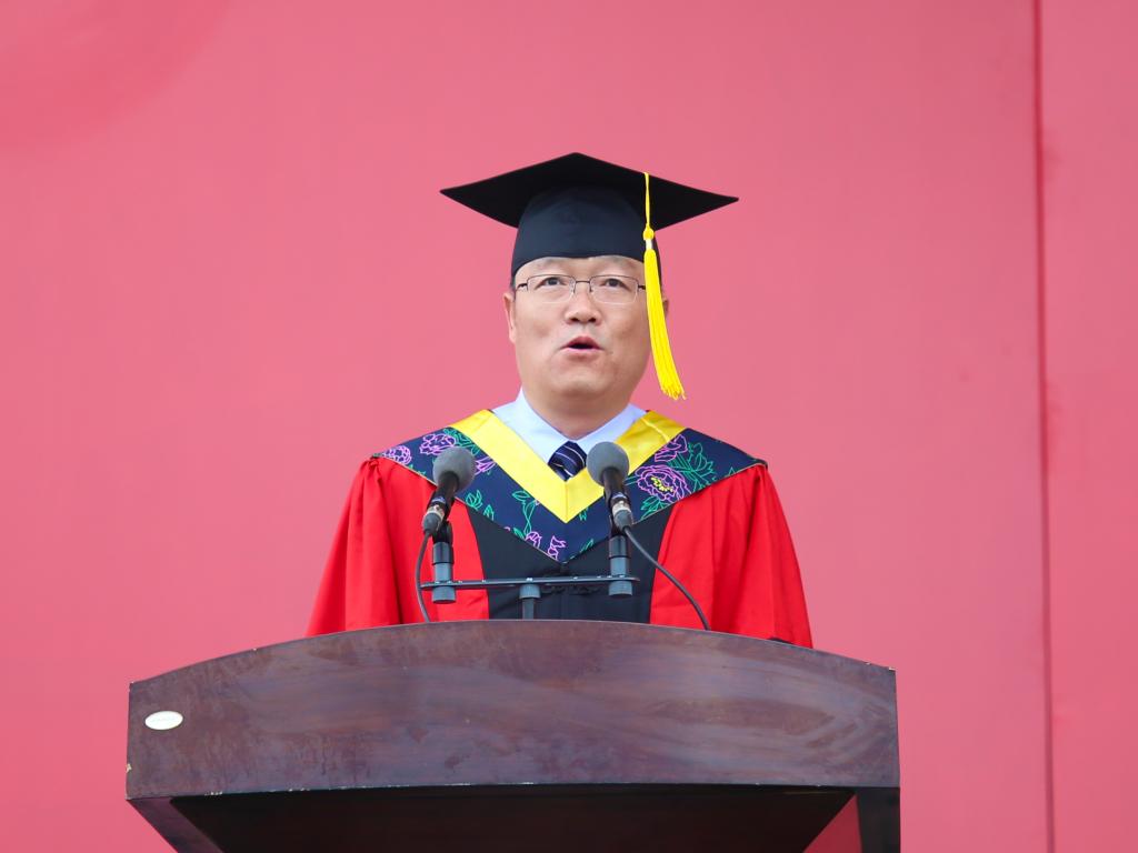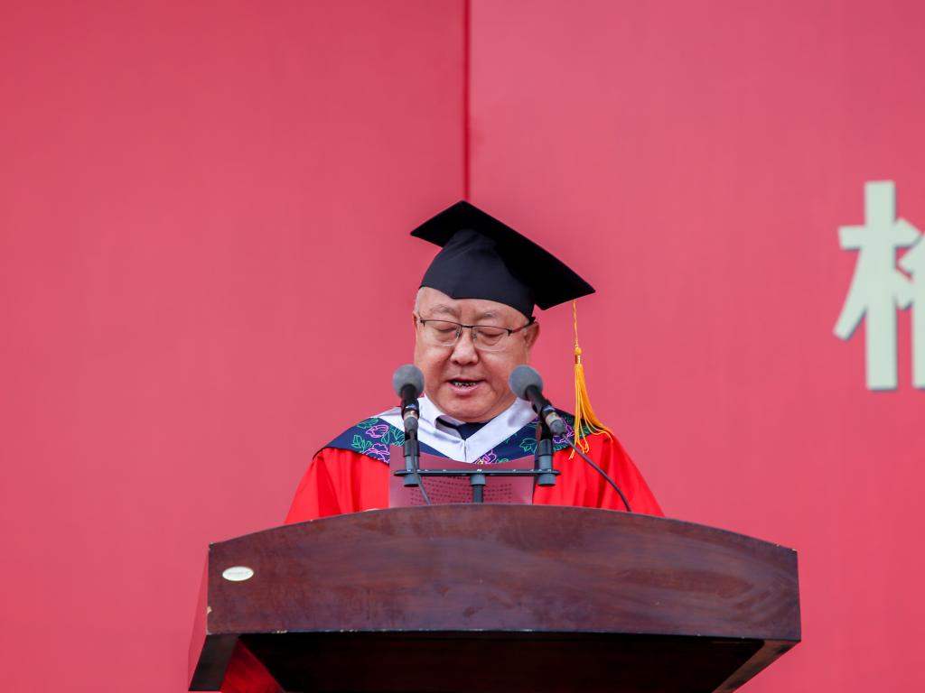 许云华代表学校向全体毕业生表示最热烈的祝贺!相逢又告别,归帆又离岸,既是往日求学的终结,更是未来幸福的开端,他寄予毕业生:假如生活是一条河流,愿你是一条执着向前的小舟;假如生活是一叶小舟,愿你是风雨无阻的水手。百年母校风华正青春,万众学子筑梦再起航,临别之际,他为同学们送上三句话:第一句是“己所不欲,勿施于人。”希望同学们能坚守做人的原则与底线,要有“已识乾坤大,犹怜草木青”的大爱之心,心怀美好,胸怀坦荡,尊重他人,平等待人;第二句是“天下难事必作于易,天下大事必作于细。”希望同学们能有“泰山不拒细壤,故能成其高;江海不择细流,故能就其深。”的胸怀,积跬步至千里,积小流成江海,从小事做起,从容易处着手,坚持不懈走好人生每一步路;第三句是“先为不可胜,以待敌之可胜。”希望同学们能时刻保持谦虚自省,心怀“国之大者”,传承红色基因,弘扬奋斗精神,牢记榆苑人的情怀、使命与担当,让青春在祖国和人民最需要的地方绽放绚丽之花!