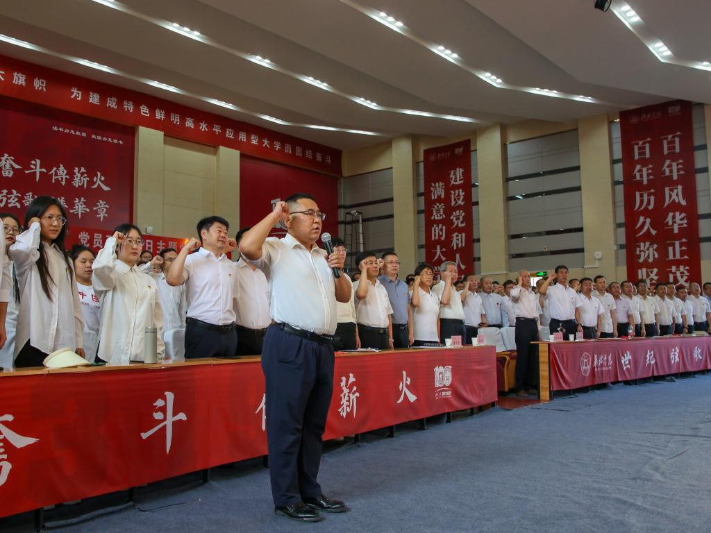 最后全体师生党员共同唱响《没有共产党就没有新中国》。党委委员、50年党龄老党员、党员处级干部、各二级党组织书记、全体党支部书记,师生党员代表、全体辅导员、2022年下半年2023年上半年新发展党员,共计600余人参加了活动。