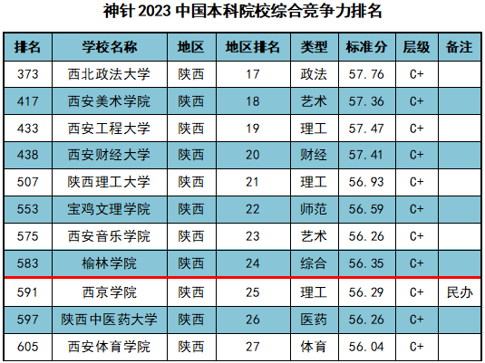 8月6日,神针2023中国本科院校综合竞争力排名发布,对象是中国1228所普通本科院校,榆林学院综合竞争力评价层级为C+,位列全国高校第583位、全国综合类高校第121位,位列陕西高校第24位、陕西综合类高校第4位。