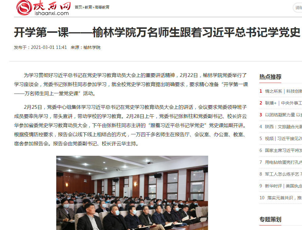 二、思想理论武装持续深化。扎实开展“不忘初心、牢记使命”主题教育、党史学习教育、学习贯彻习近平新时代中国特色社会主义思想主题教育,坚持党委会“第一议题”制度、党委理论中心组学习制度、将习近平新时代中国特色社会主义思想“三进”工作列入年度重点工作,党委书记累计为新生赠送《平凡的世界》10000余册,多次主讲开学第一课。班子成员开展“走进公寓问需求,畅谈平凡话奋斗”活动,为学生排忧解难。配齐建强思政课专兼职教师队伍。我校马克思主义学院获批陕西省重点马克思主义学院培育单位。严格按照1:350的师生比要求配齐建强思政课专兼职教师队伍,按照1:200的要求配备辅导员,为学生上思想政治理论课和形势政策课,持续开展思想教育。打造的高水平红色校史剧《播火者》《李子洲在1929》(入选教育部2022年“高校原创文化精品推广行动计划”),在北京、西安、榆林等地持续巡回展演,引起全国高度关注。出台《榆林学院“一站式”学生社区建设方案》,打造了“一站式”学生社区综合管理模式,探索构建了“科学研究、能力提升、人格养成、红色基因传承”四位一体的人才培养模式,实施“五乐育人”工程,引导学生“乐读、乐讲、乐劳、乐唱、乐跑”,赋能“大思政”教育新格局。