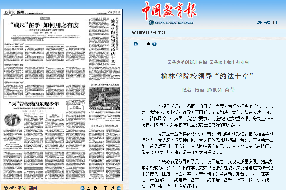 五、纪律作风教育更加严实。校党委严格落实全面从严治党主体责任和监督责任,把全面从严治党贯穿学校事业发展全过程、全领域。每年召开全面从严治党工作会议,制定并落实全面从严治党年度工作任务,印发《中共榆林学院委员会及班子成员全面从严治党主体责任清单》,逐级压实全面从严治党责任,加强督促指导和年底考核,推动全面从严治党责任在基层落实落细。强化政治监督,确保学校成为“两个维护”的坚强阵地。坚持政治巡察定位,稳步推进五轮校内巡察,对全校14个二级党组织进行了常规政治巡察。强化问题整改督办,注重巡察成果推广运用,推动教书育人、管理育人、服务育人落到实处。通过巡察全面清查整治了突出问题,规范了党务工作。学校党委持续“纠作风、改作风、转作风”,出台《榆林学院深化作风建设提升干部能力专项行动方案》,持续加大执纪审查力度,充分运用“四种形态”和“三个区分开来”监督执纪严格落实中央八项规定精神和省委实施意见,出台了《榆林学院加强干部纪律作风建设工作方案》,《中共榆林学院委员会关于强化激励约束推动作风建设的若干措施》,深入开展作风建设专项行动,持之以恒抓作风建设。出台《关于推进清廉榆林学院建设的实施方案》,扎实开展公务用车、办公用房和群众身边腐败和作风问题专项排查整治。成立了党委督查室,实施首问负责制、限时办结制、全员满意度测评、“教师最多跑一次”改革,机关平均满意度达到91.5%,干部作风明显好转。