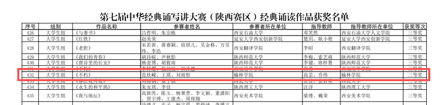 在近日公布的第七届中华经典诵写讲大赛(陕西赛区)获奖名单中,我校研究生范欣嵘、王琪、刘雨彤三位同学的作品《不朽》力克群雄,荣获经典诵读赛项大学生组三等奖,用声音的力量为校争光!