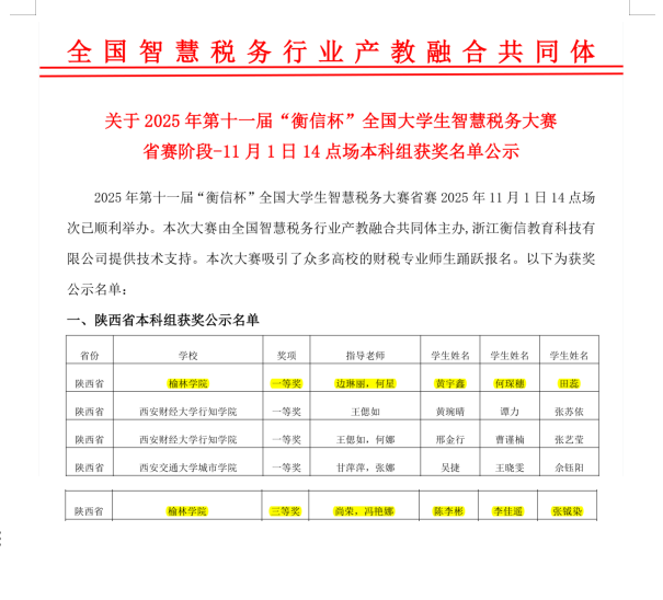 在近日落幕的2025年“衡信杯”全国大学生智慧税务大赛省赛中,我校选派的两支代表队双双告捷,由管理学院边琳丽、何星老师指导,何琛穗、田蕊、黄宇鑫组成的参赛队成功卫冕省级一等奖(第一名);由尚荣、冯艳娜老师指导,李佳瑶、陈李彬、张钺染组成的参赛队荣获三等奖。优异成绩充分彰显了我校学子的卓越实力。届时,一等奖团队将代表陕西载誉出征全国总决赛,为校续争荣光。