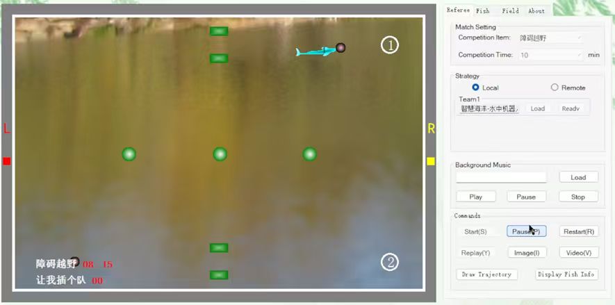 本次参赛的2D仿真障碍越野项目为10分钟限时排位赛,要求参赛队伍操控仿真鱼在标准场地内完成两阶段推球任务。第一阶段需绕过圆柱障碍,携带1号球通过方孔并推入1号洞;第二阶段返回起点后,绕过三个圆柱障碍,携带2号球通过方孔并推入2号洞。项目按任务完成情况计分,每完成一个阶段得5分,总分10分,未按规定绕行障碍或未通过方孔将相应扣分,总分相同时以进球耗时短者胜出。