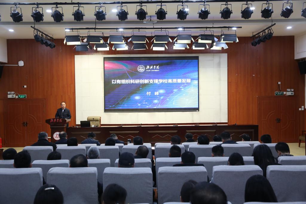 最后,付峰作了题为《以有组织科研创新支撑学校高质量发展》的总结报告。他强调,教学与科研是现代大学的根本属性,高校应自觉担当教育强国、科技强国、人才强国的使命,坚持“四个面向”,推动科研从“自由探索”向“需求牵引”、从“个体研究”向“团队协同”升级。他分析了我校“十四五”以来科研工作进展与深层问题,指出学校科研虽处于快速发展期,但仍存在重大重点项目偏少、核心技术攻关能力弱、高水平团队缺乏等问题。为此,他提出应形成“教学决定生存、科研决定水平、服务决定地位、质量决定兴衰、制度决定成败”的共识,围绕重大任务构建“大项目-大团队-大平台-大成果”良性循环,弘扬科学家精神,做实科研贡献,支撑学校与区域高质量发展。