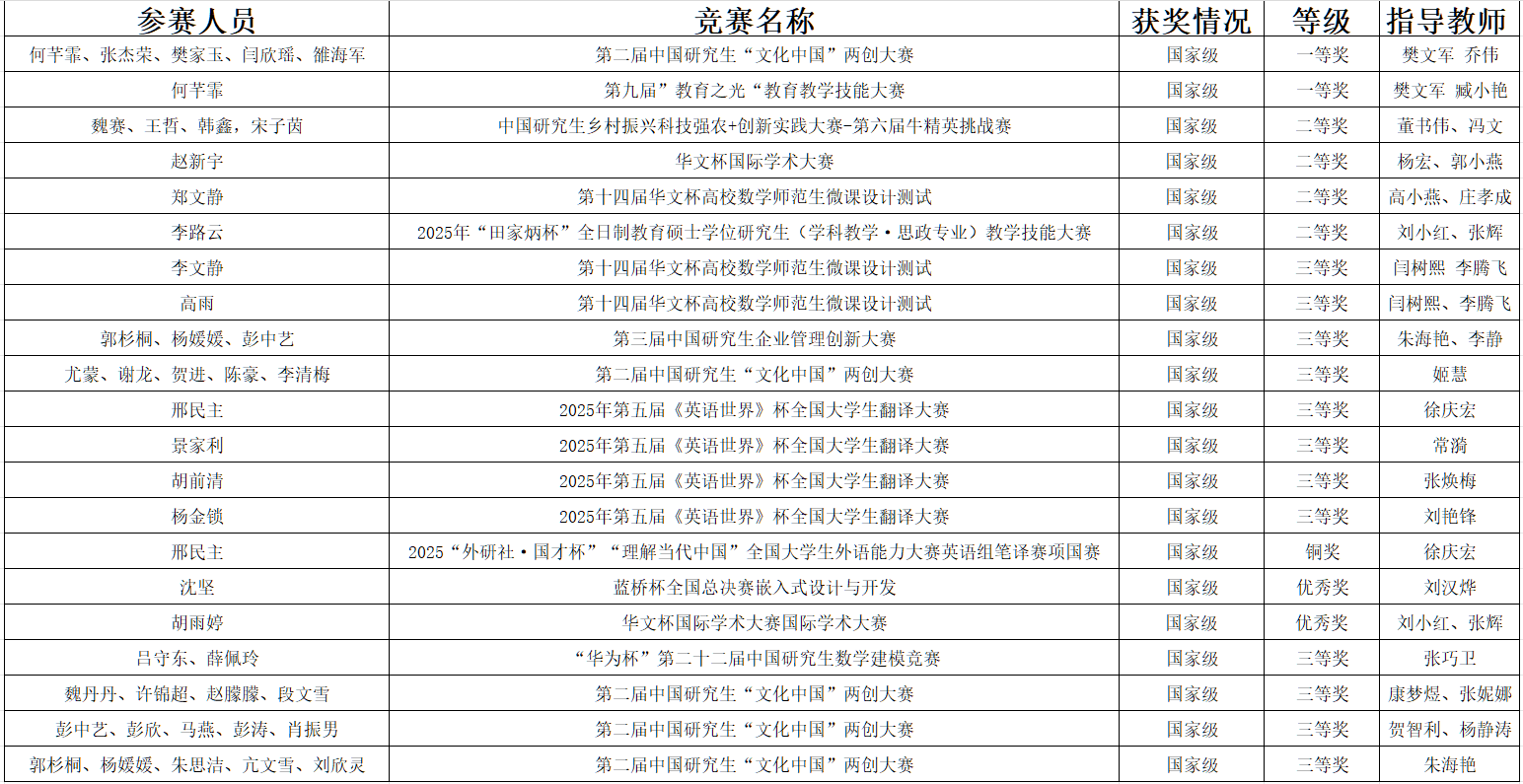 文、理、工、农、管、教等多学科门类学子在国家级赛场多点开花,累计斩获21项荣誉。文学院院长樊文军指导、乔伟老师带队,在全国5398支报名队伍的激烈角逐中脱颖而出,一举拿下第二届中国研究生“文化中国”两创大赛全国总决赛一等奖;研究生院院长张雄带领畜牧领域硕士师生共12人参加,从全国118支队伍中突围,在第六届全国“牛精英挑战赛”荣获全国二等奖;信息工程学院刘传星在第六届码蹄杯全国大学生程序设计大赛中脱颖而出,斩获国家级金奖;生命科学学院郑洁文团队聚焦绿色发展,作品获第二届大学生低碳循环科技创新大赛国家级二等奖;数学与统计学院、外国语学院、马克思主义学院等多个学院学子亦在各自领域赛事中斩获国家级奖项。