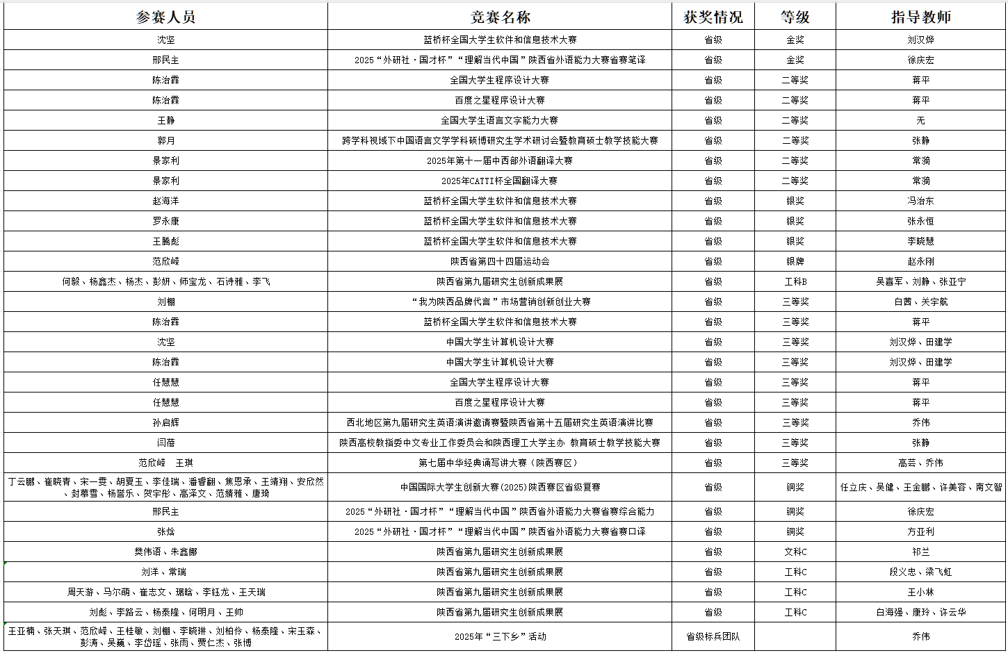 我校研究生在区域层面逐步展现出强劲竞争力,累计收获30项省级奖项。信息工程学院沈坚在蓝桥杯嵌入式设计大赛省赛中摘得金奖,陈治霖则在码蹄杯、百度之星程序设计大赛中两度斩获省级二等奖;外国语学院邢民主表现亮眼,斩获“外研社·国才杯”陕西省外语能力大赛笔译金奖与综合能力铜奖,景家利也在中西部外语翻译大赛等赛事中收获两项省级二等奖;文学院、现代农学院学子分获教育类、科创类省级赛事奖项;在陕西省第九届研究生创新成果展中,建筑工程学院团队获工科B类奖,数学与统计学院等4个团队获工科C类奖。